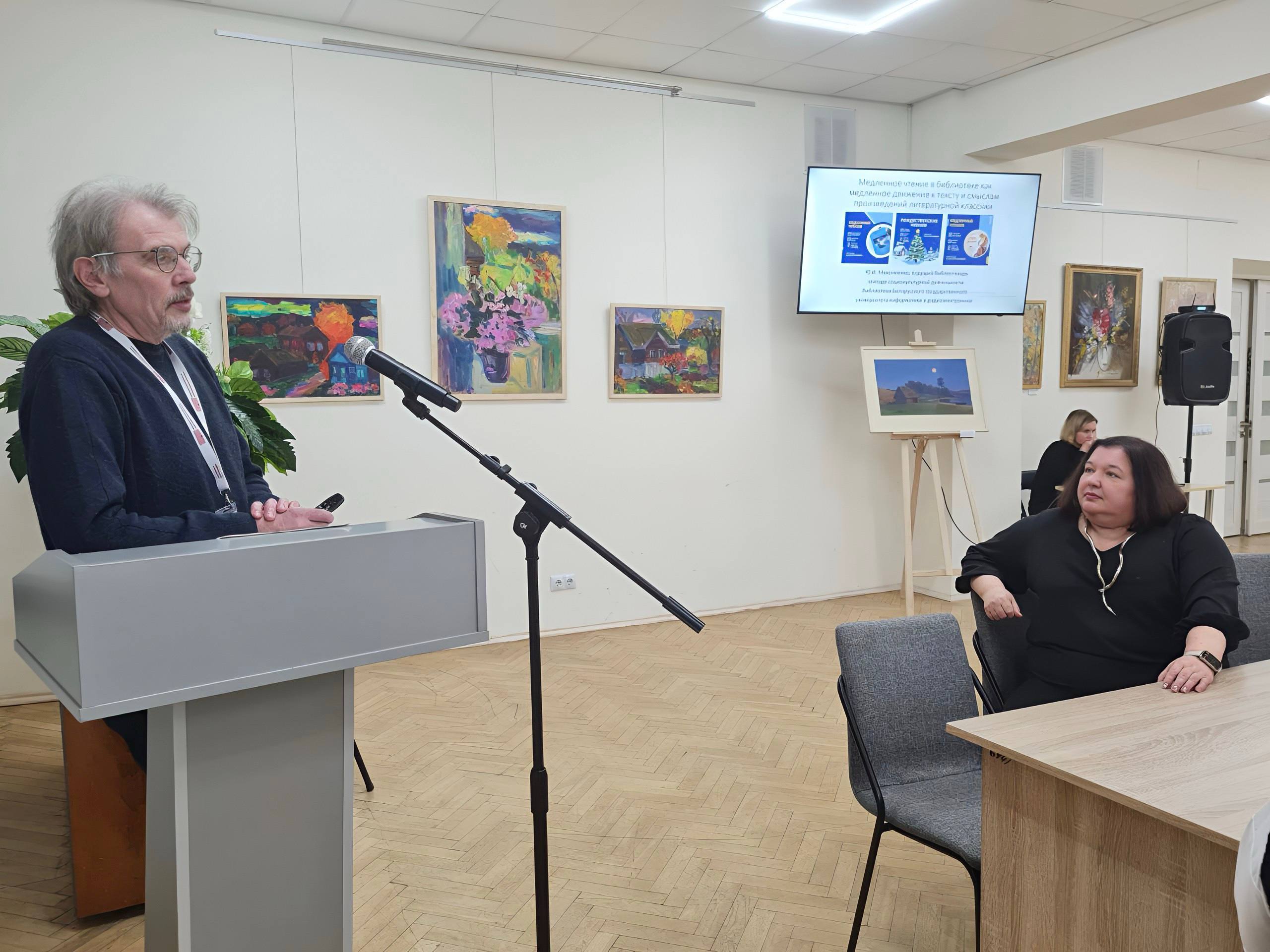 В круглом столе приняла участие библиотека БГУИР. Юрий Иванович Максименко, ведущий библиотекарь сектора социокультурной деятельности выступил с докладом на тему «Медленное чтение в библиотеке как медленное движение к тексту и смыслам мировой литературной классики». Его выступление вызвало живой интерес и стало отправной точкой для бурных обсуждений: участники активно обменивались мнениями о роли «медленного чтения» в формировании читательской культуры, делились опытом внедрения подобных практик в различных библиотечных пространствах и поднимали вопросы сохранения глубинного восприятия текста в эпоху цифровых технологий.