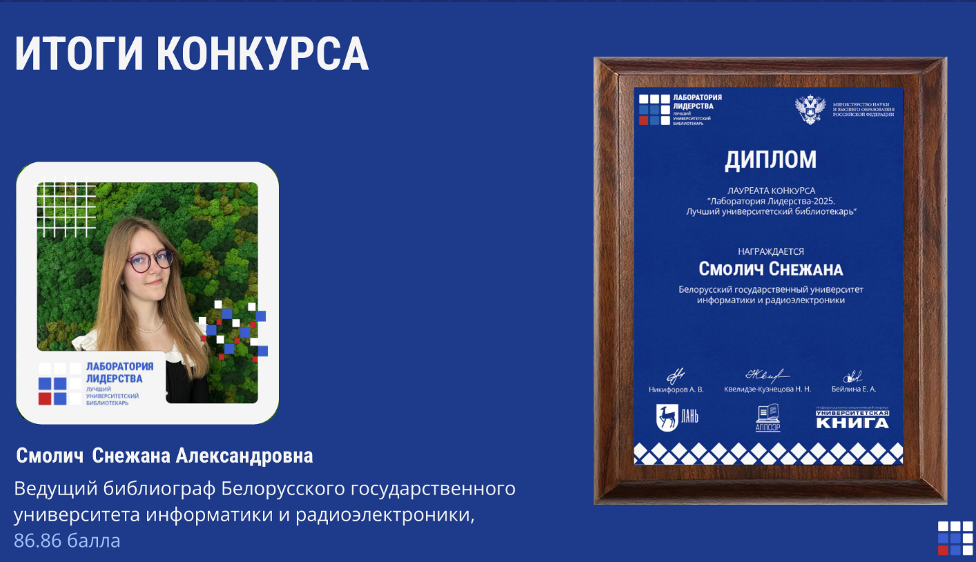Смолич Снежана заняла 8 место в международном конкурсе «Лаборатория лидерства: лучший университетский библиотекарь – 2025!»